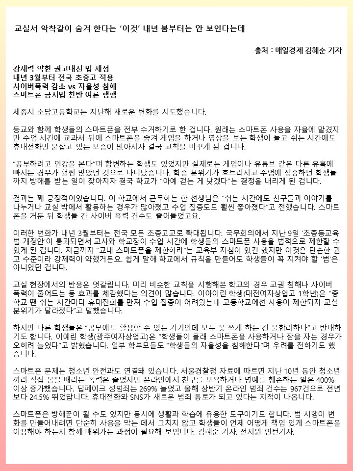 ② [교실서 악착같이 숨겨 한다는 ‘이것’ 내년 봄부터는 안 보인다는데]
