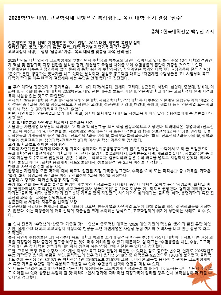 ② [2028학년도 대입, 고교학점제 시행으로 복잡성↑… 목표 대학 조기 결정 ‘필수’]