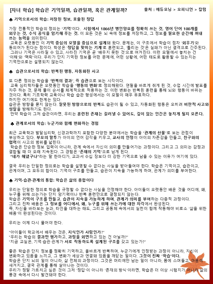① [자녀 학습] 학습은 기억일까, 습관일까, 혹은 관계일까?
